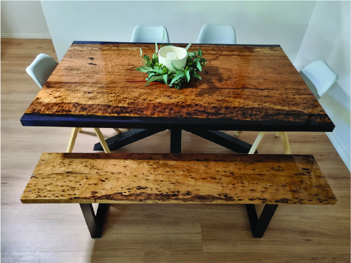 I handcraft each piece using responsibly sourced WA hardwoods — Jarrah, Marri, Blackbutt, Spotted Gum and Tuart — with resin accents and steel legs made by local fabricators.
